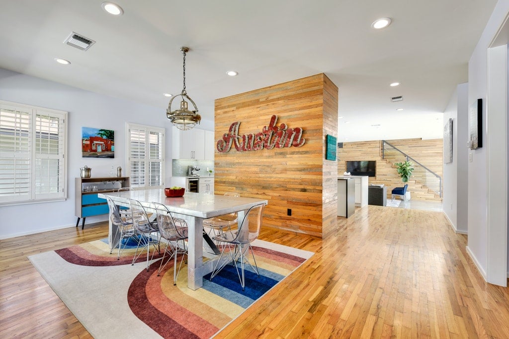 We start on the ground floor with multiple living areas, master suite + office / exercise room attached, along with a full bath and well appointed MUD room that exits to the backyard. The heart of the home truly centers around the kitchen which overlooks the main family room via a bartop and boasts valuable prep island. Awash in natural light and soaring ceilings, the owners integrated an accent wall of reclaimed wood from a home in South Austin's Bouldin neighborhood. The master suite has a freestanding acrylic tub with a rainfall walk-in shower, dual vanity sinks (don't miss the floating mirrors), and large walk-in closet.