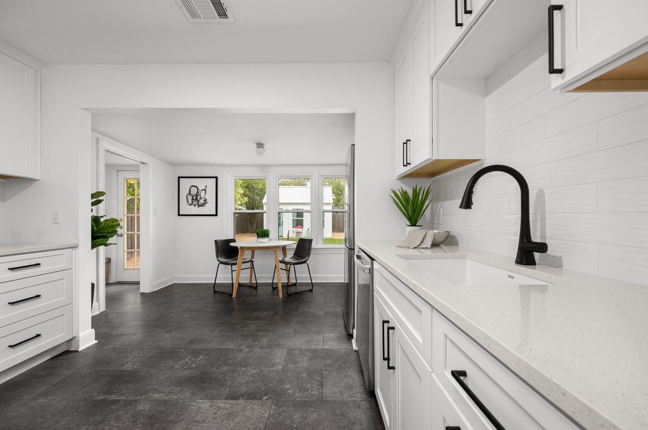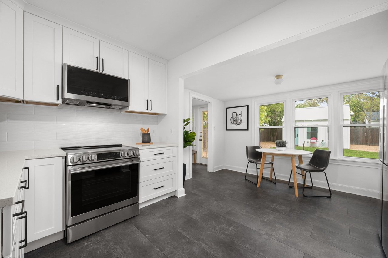 Paying homage to the home's heritage, original wood floors sprawl through the main living / dining and well appointed bedrooms with a large walk-in w/ tailored shelving. The spacious kitchen now sports new cabinetry, quartz counters offer ample space for food prep, updated flooring and stainless appliances while providing backyard views and a wealth of sunlight thru the wall of windows along the back of the home.