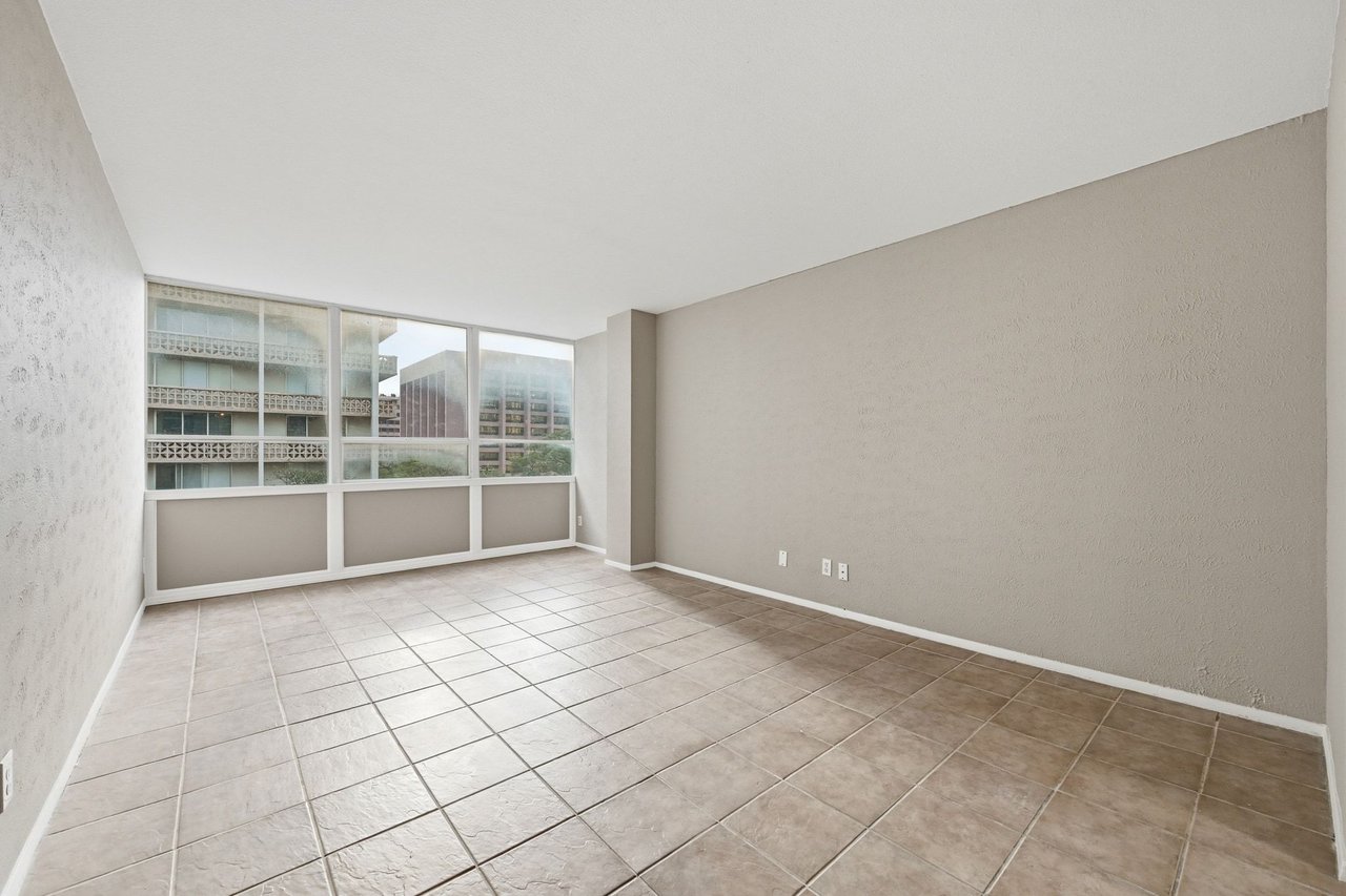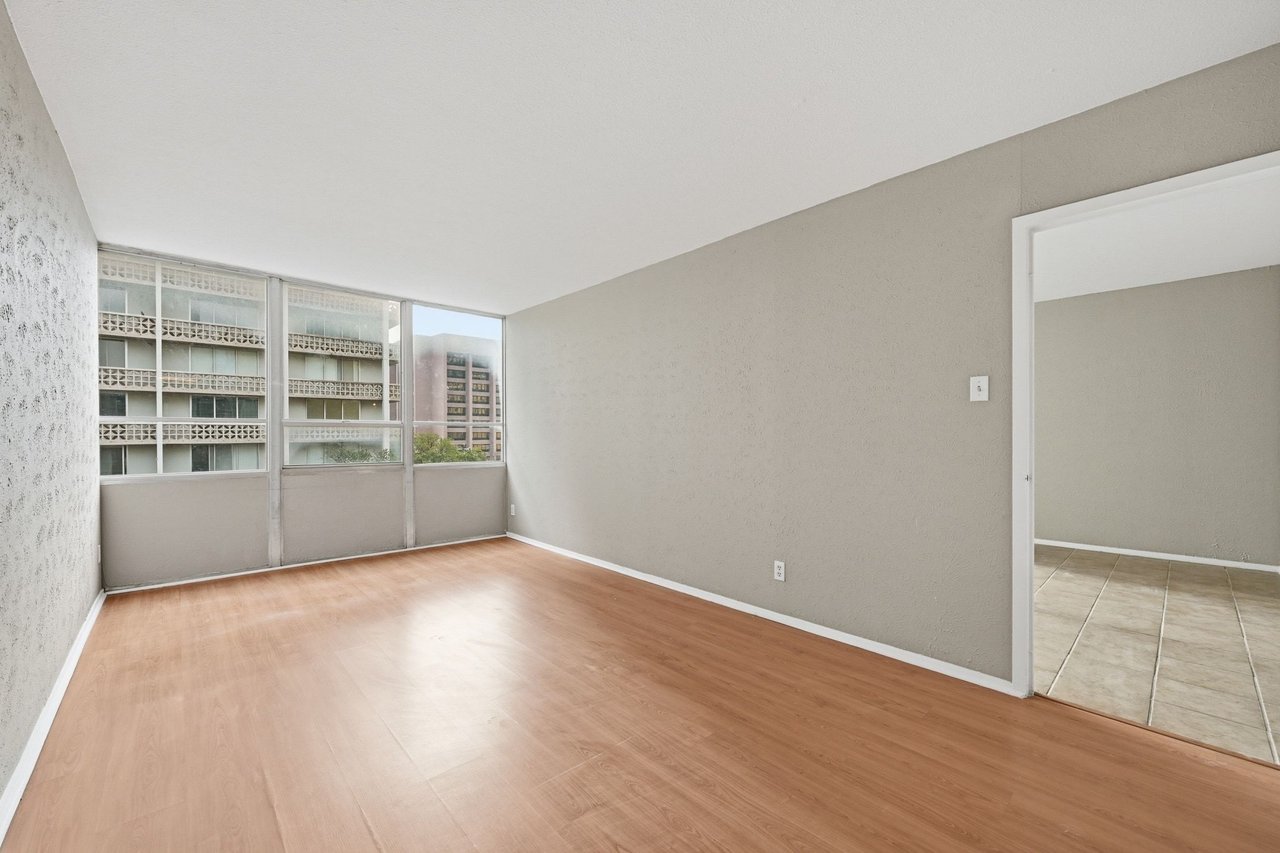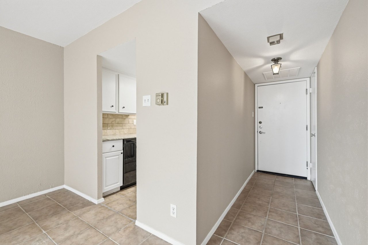 Inside, the open layout is designed for comfortable urban living. The remodeled kitchen features granite countertops, stainless steel appliances, and easy-to-maintain tile flooring that extends into the spacious living area creating a cohesive, durable space ideal for both daily living and entertaining. Large windows in the living area bring in abundant natural light and showcase calming downtown views, giving the space an airy, welcoming feel.