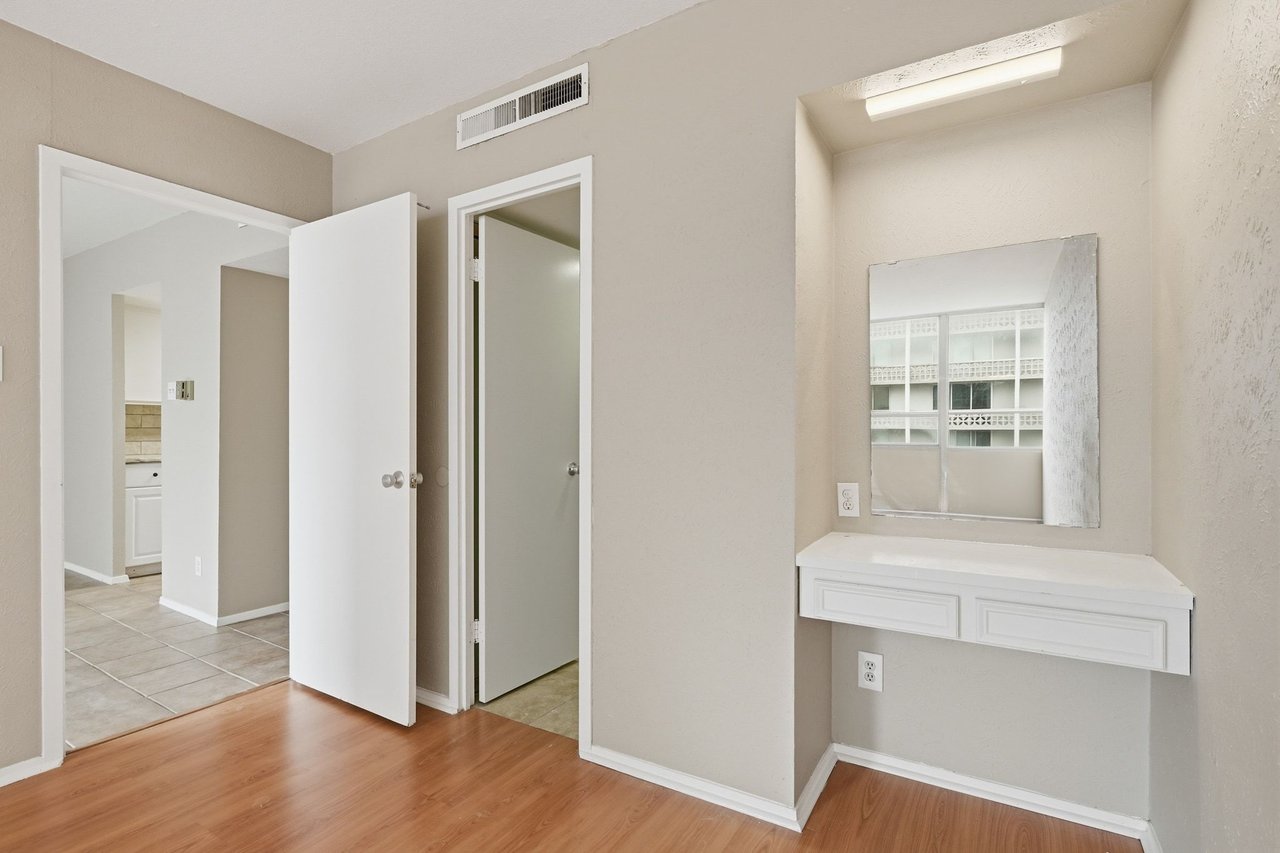 The bedroom offers wood-like laminate flooring and includes a built-in workstation, making it ideal for students, remote professionals, or anyone needing a dedicated workspace at home. The updated bathroom features a walk-in glass shower, modern tile surround, and contemporary vanity, adding a clean, refreshed finish to the home. Whether you're looking for an Austin presence, UT-adjacent housing, or a low-maintenance downtown investment, this condo offers a rare chance to own in one of Austins most central locations with unbeatable access to education, culture, and the energy of downtown living.