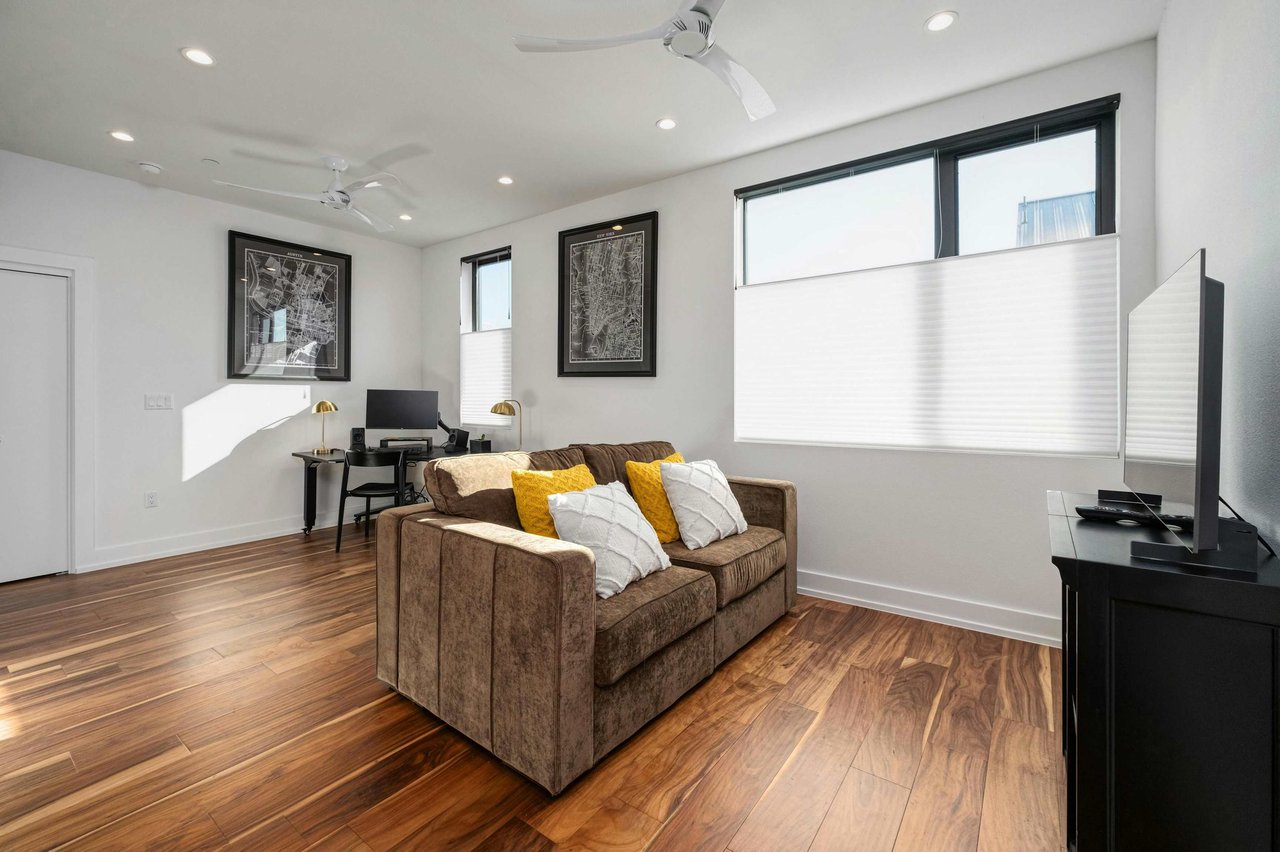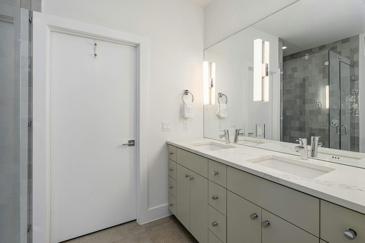 Upstairs buyers will savor the tall bedroom ceiling height, wood floors and convenient laundry area. The primary bedroom looks over the private patio on the main level, and includes a spacious walk-in shower and dual vanity.